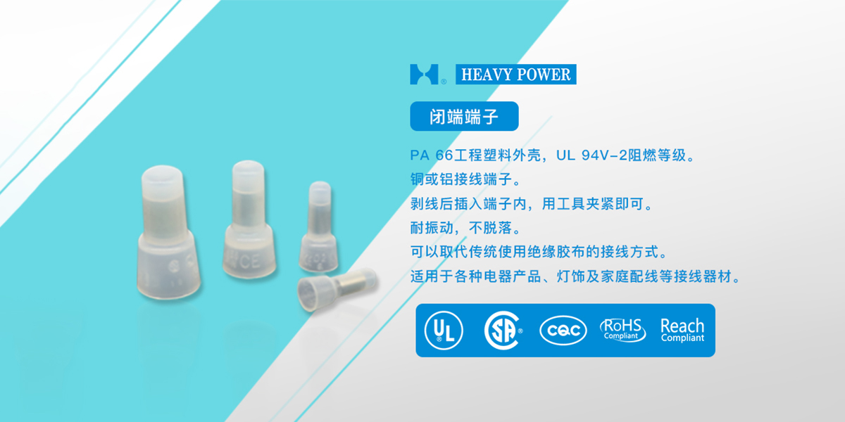 一、閉端端子特點1、PA 66工程塑料外殼,UL 94V-2阻燃等級。2.銅或鋁接線端子。3.剝線后插入端子內(nèi),用工具夾緊即可。4.耐振動,不脫落。5.可以取代傳統(tǒng)使用絕緣膠布的接線方式。6.適用于各種電器產(chǎn)品、燈飾及家庭配線等接線器材。